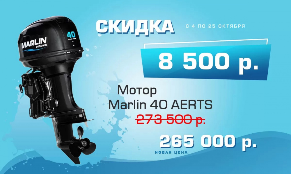 Объявляем сезонную акцию на моторы Marlin! Только с 4 по 25 октября 2021 г. снижаем цены до 8 500 рублей! Не упустите возможность сейчас выгодно приобрести качественный мотор Marlin!